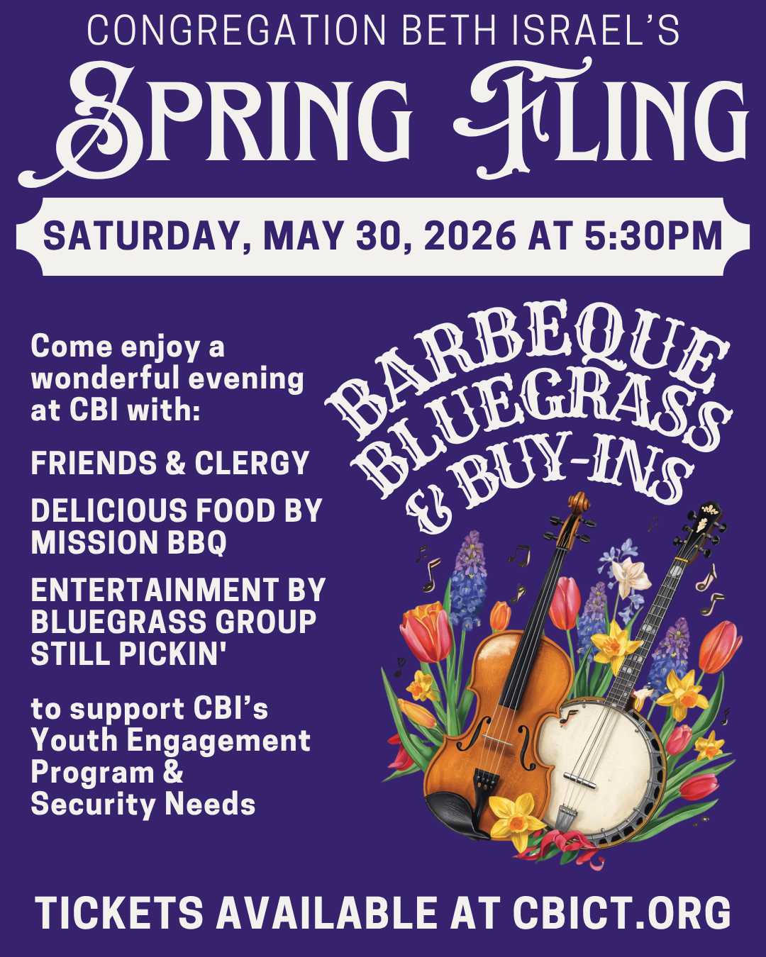 Join us for our annual fundraiser featuring dinner by Mission BBQ and the Bluegrass group Still Pickin’! We’ll enjoy Havdalah followed by Hors d’oeuvres and Dinner, the Buy-In Party Extravaganza and a Silent Auction! We hope all can attend for a fun evening…but if you can’t and would still like to support CBI, enter a donation at cbict.org/support. Thank you and we look forward to a wonderful event with our amazing community! This fundraiser supports our Youth Engagement Program and Security Needs.